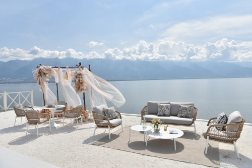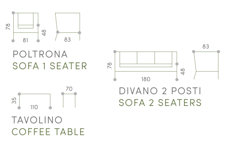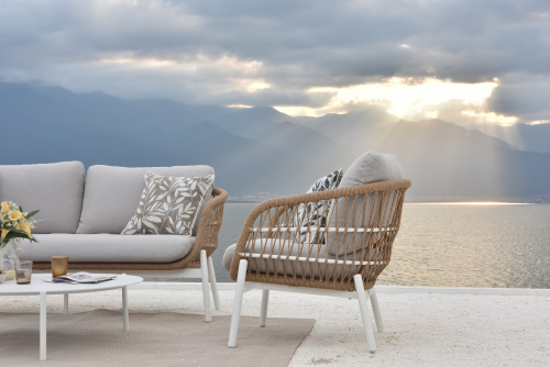 Уличный комплект Elba состоит из двухместного дивана, двух кресел и журнального столика со столешницей из алюминий. Алюминиевый каркас оплетен синтетическим роупом, мягкие подушки на сиденьях и спинках со съемными чехлами из олефина, устойчивого к загрязнениям и ультрафиолетовому излучению.