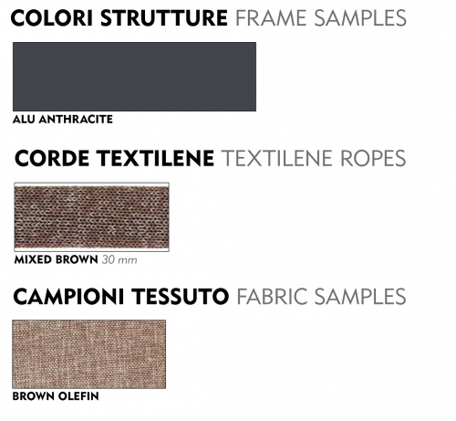 Комплект Panama состоит из двухместного дивана, двух кресел и журнального столика. Устойчивый и надежный каркас из алюминия кресел и дивана оплетен текстиленовым и резиновым канатом. Подушки из текстилена обеспечивают дополнительный комфорт. Журнальный столик выполнен из алюминия. Стильный и удобный комплект можно разместить в зоне отдыха в помещении или на открытом воздухе.