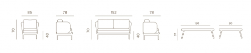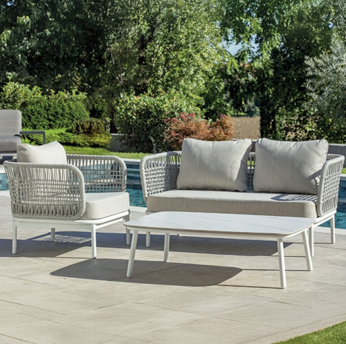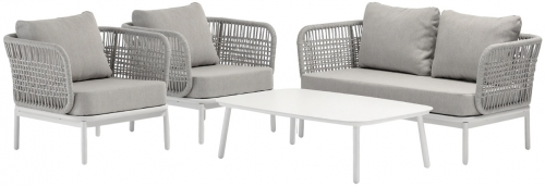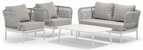 Уличный комплект Yolk включает двухместный диван, два кресла и журнальный столик с алюминиевой столешницей. Каркас из алюминия оплетён прочным роупом диаметром 6 мм (полиэстер), а сиденья и спинки оснащены мягкими подушками с легко снимаемыми чехлами из олефиновой ткани, устойчивой к загрязнениям и воздействию ультрафиолета.