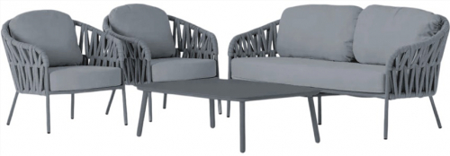 Садовый комплект мебели Victory - это идеальное сочетание современного дизайна, высокого качества изготовления и максимального комфорта. Этот комплект, состоящий из просторного дивана, двух удобных кресел и стильного журнального столика с алюминиевой столешницей, станет роскошным решением для отдыха на открытом воздухе: на террасе, в саду или в гостиной. Прочный алюминиевый каркас обтянут полиэстером и резиновым канатом, а съёмные подушки из олефина с водоотталкивающей пропиткой обеспечат максимальный комфорт.