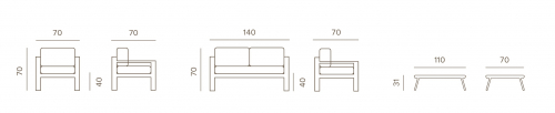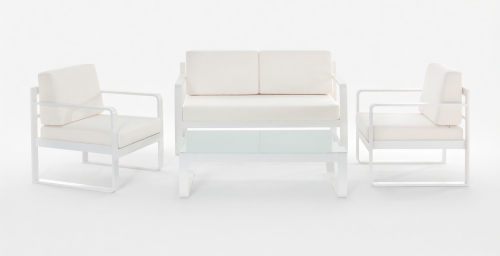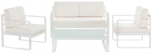 Комплект Capri состоит из дивана, двух кресел и журнального столика. Каркас мебели выполнен из алюминия с порошковым покрытием, подушки на диване и креслах - из стойкого к истиранию и ультрафиолетовому излучению олефина, столешница журнального столика - из стекла. Такой комплект украсит лаунж-зону возле бассейна или на террасе загородного дома.