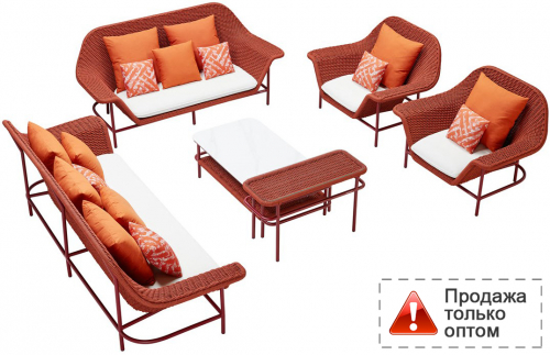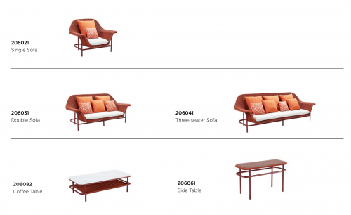 Набор для террасы и сада Lisboa состоит из 3-местного дивана, 2-местного дивана, двух удобных кресел, кофейного столика и бокового столика, который при необходимости можно расположить между креслами. Кофейный столик создан из уникального сочетания материалов: алюминия и веревки, со столешницей из спеченного камня, а боковой столик имеет прозрачную стеклянную столешницу. Подушки изготовлены из прочного текстиля, идеально подходящего для уличной мебели, и наполнены быстросохнущей пеной. Применение специально разработанных материалов позволяет использовать коллекцию на открытом воздухе в полной безопасности, обеспечивая максимальную защиту от атмосферных воздействий без ущерба для эстетики и комфорта.