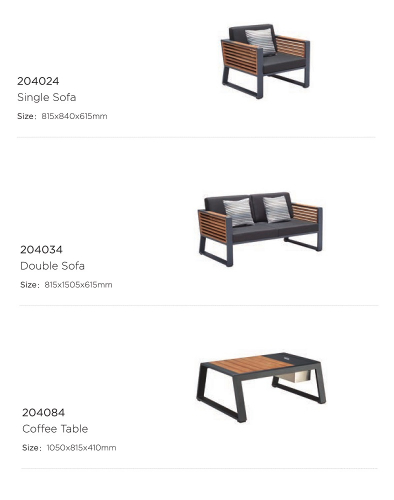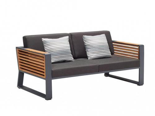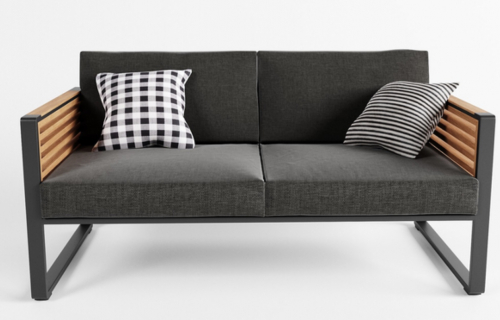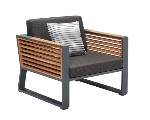 Для подушек выбран олефин, материал на основе полипропилена, легкий, с низкой степенью влагопоглощения и быстросохнущим. Превосходная устойчивость к солнечному свету и плесени, и, прежде всего, материал, который не выцветает. Идеально подходит для этой коллекции, где преобладает черный цвет: от черного цвета обивки до черного цвета алюминиевой конструкции с порошковым покрытием, которые, в отличие от искусного использования тикового дерева, создают ощущение сильной динамики.