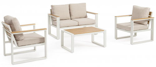 Комплект лаунж мебели Leandro — превосходный спутник для создания незабываемых моментов на свежем воздухе или в уютном уголке дома. Каждый элемент комплекта Leandro создан с любовью к деталям и акцентом на высокое качество. Алюминиевая конструкция с порошковым покрытием не только гарантирует долговечность и стойкость к капризам погоды, но и придает мебели современный и утонченный вид, который легко впишется в любой ландшафтный дизайн. Вставки из древесно-полимерного композита (ДПК) на подлокотниках, спинке дивана и кресел, а также на столешнице создают гармонию с природой, добавляя теплоты и текстуры.