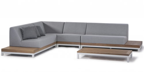 Комплект модульной мягкой мебели Ivory - садовая мебель высокого уровня со своим собственным уникальным стилем. Каркас состоит из окрашенных в белый цвет алюминия ножек, на которые накладывается лист из тикового дерева, , который слегка выступает по бокам дивана для создания удобных боковых столиков. Покрытие выполнено из ткани Sunbrella - материала, специально обработанного для наружного применения, стойкого к ультрафиолетовому излучению, водоотталкивающего, но в то же время воздухопроницаемого, стойкого к появлении плесени и пятен, наполнение - быстросохнущий поролон (fast dry foam). Этот угловой диван подходит для комфортного размещения 7 и более человек. Благодаря отличному качеству изготовления и используемым материалам этот комплект может прослужить долгие годы, не выцветая и не изнашиваясь. По этой причине он подходит как для дома, так и для общественных мест.