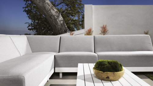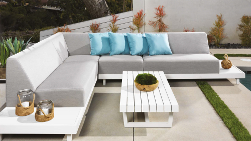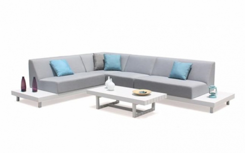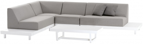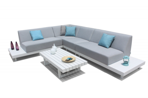 Alvory - это модульный лаунж комплект с элегантным современным дизайном. Комплект состоит из углового и прямых модулей. Наполнение из быстросохнущего поролона имеет дренажную конструкцию на основе сетки и покрыто воздухопроницаемой водонепроницаемой тканью Sunbrella, которая устойчива к плесени, пятнам и ультрафиолетовым лучам. Регулируемые ножки и легкий алюминиевый каркас выходят за пределы мягкой зоны, образуя два боковых столика, создавая разнообразие уровней и форм, кофейный столик также выполнен из алюминия. Этот комплект дополнит отдых у бассейна или в саду. Благодаря тому, что он состоит из отдельных частей, можно расставить мебель по своему предпочтению.