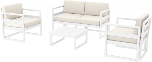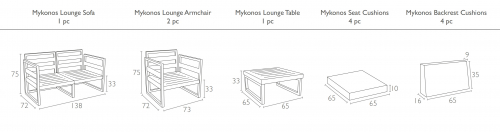 Комплект Mykonos Lounge Set предназначен для удобной самостоятельной сборки, изготовлен из прочного атмосферостойкого пластика, армированного стекловолокном. В комплекте идут удобные мягкие подушки, обеспечивающие дополнительный комфорт.