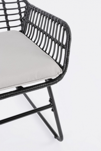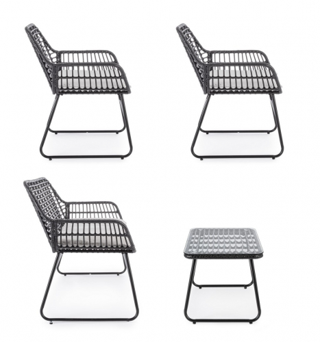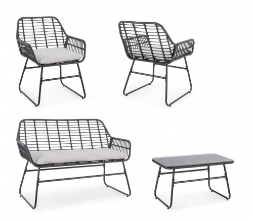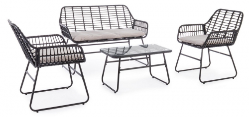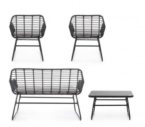 Плетеный комплект лаунж мебели Burrel с удобными подушками на сиденьях станет отличным выбором для обустройства летних площадок на свежем воздухе. Набор разработан для комфортного размещения четырех человек и создания уютной обстановки, располагающей для приятного времяпрепровождения в кругу друзей и близких. Каркас всей мебели представлен в виде полозьев из стали, что обеспечивает максимальную устойчивость и надежность.