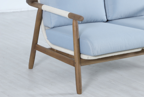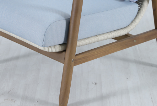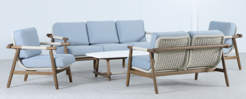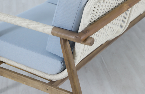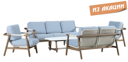 Apoyo - это стильная коллекция уличной мебели из массива АКАЦИИ, в которой сочетаются натуральное верёвочное (роуп) плетение, тёплая текстура дерева и комфортные подушки. Комплект для отдыха состоит из двухместного и трехместного диванов, двух комфортных кресел, двух журнальных столиков. Превосходное решение для террасы или веранды, подходящее для тех, кто ценит долговечность и эстетический вид уличной мебели