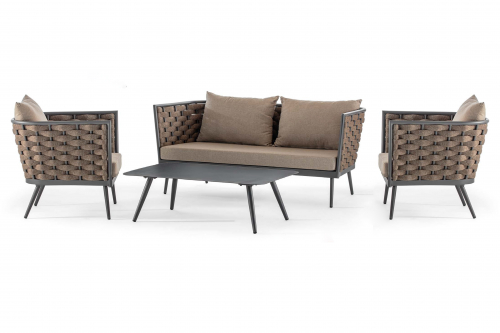 Комплект Nizza состоит из двухместного дивана, двух кресел и журнального столика. Алюминиевый каркас с порошковым покрытием делает мебель комплекта устойчивой и надежной. Подлокотники и спинки кресел и двухместного дивана Nizza оплетены текстиленом и резиновым канатом, благодаря чему комплект выглядит стильно в любом помещении или на открытой площадке. Подушки с устойчивыми к пятнам и ультрафиолетовому излучению съемными чехлами из олефина обеспечивают комфортный отдых.