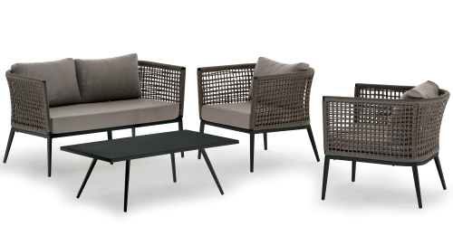 Комплект Cuba состоит из двухместного дивана, двух кресел и журнального столика, каркас которых выполнен из алюминия с порошковым покрытием. Кресла и диван имеют низкую спинку, которая создает одно целое с подлокотниками благодаря канатному плетению из полиэстера Ø4 мм. Объемные и мягкие подушки, созданные для максимизации комфорта, выполнены из олефина, устойчивого к пятнам и ультрафиолетовому излучению. Коллекция Cuba идеально подходит для тех, кто хочет произвести впечатление с помощью дизайнерской мебели в интерьере и на открытых площадках.