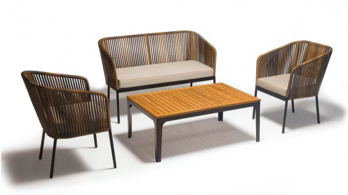 Плетеный лаунж комплект выполнен из алюминия и искусственного ротанга (полиэтилен), и рассчитан на отдых 4-х человек. Комфортный диван и кресла с мягкими подушками на сиденьи и небольшой столик обеспечивают приятный отдых на террасе или летней площадке частного дома, сада или отеля, бара, ресторана.