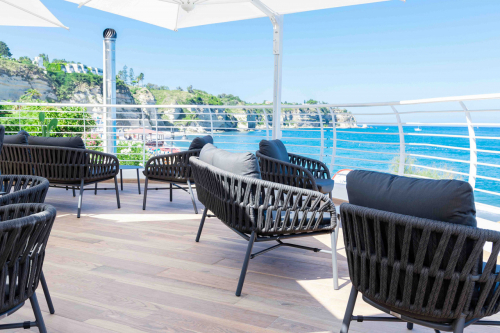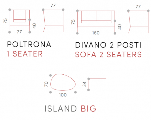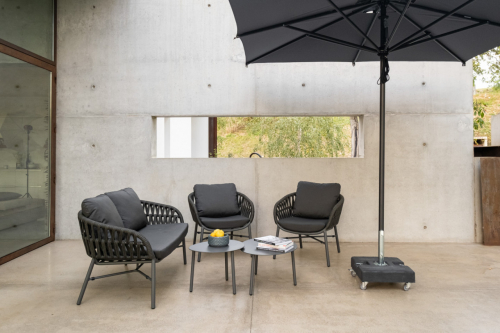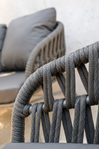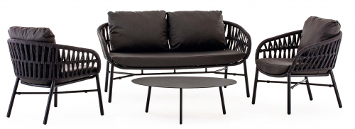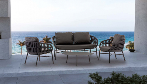 Tahiti - это современный садовый комплект, который создает открытую зону отдыха, подходящую для четырех человек, состоящий из двухместного дивана, двух кресел и журнального столика. Мебель имеет алюминиевый каркас с порошковым покрытием. Диван и кресла дополняются переплетением из полиолефинового каната и подушками на сиденье и спинке. Чехлы на подушках выполнены из текстилена, устойчивого к воздействию ультрафиолетовых лучей и плесени. Журнальный столик Island Big выполнен из алюминия. Столешница - алюминиевый лист толщиной 5 мм.