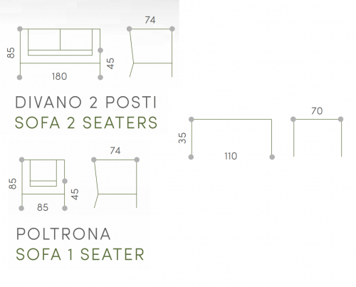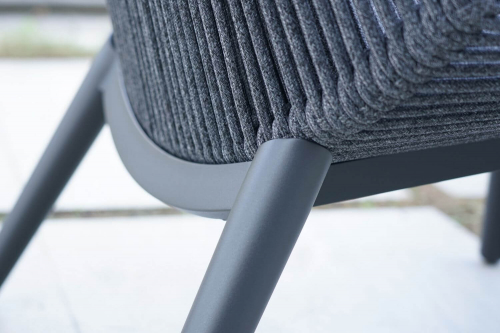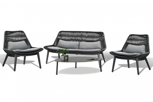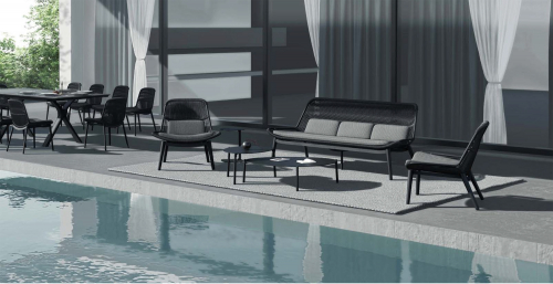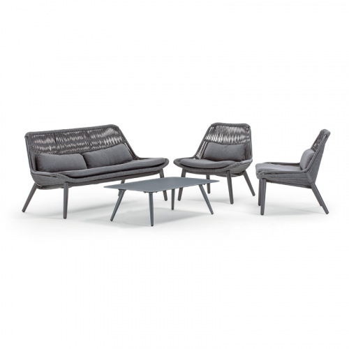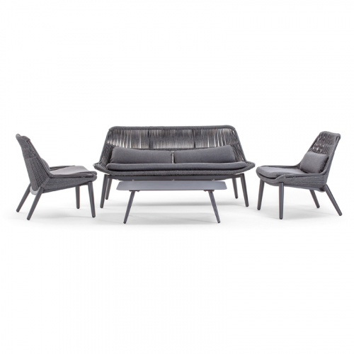 Комплект Como - это двухместный диван, два кресла и низкий столик из алюминия. Плетение дивана и кресел выполнено из акрилового каната Ø9 мм. Подушки на сиденьях и спинках выполнены из олефина - материала, устойчивого к пятнам и ультрафиолетовому излучению. Такой комплект будет уместен как в частных зонах отдыха, так и на террасах отелей, кафе и баров.