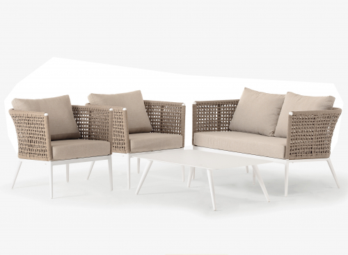 Комплект Cuba состоит из двухместного дивана, двух кресел и журнального столика, каркас которых выполнен из алюминия с порошковым покрытием. Кресла и диван имеют низкую спинку, которая создает одно целое с подлокотниками благодаря канатному плетению из полиэстера Ø4 мм. Объемные и мягкие подушки, созданные для максимизации комфорта, выполнены из олефина, устойчивого к пятнам и ультрафиолетовому излучению. Коллекция Cuba идеально подходит для тех, кто хочет произвести впечатление с помощью дизайнерской мебели в интерьере и на открытых площадках.