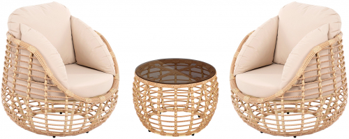 Практичность ансамбля обеспечивается продуманным выбором материалов. Прочные алюминиевые каркасы, устойчивое к погодным условиям плетение и закалённое стекло столешницы гарантируют долговечность и простой уход. Этот сбалансированный комплект - готовое элегантное решение для оформления террасы, патио или зоны отдыха, где каждая деталь подчеркивает единство стиля, комфорта и надёжности.