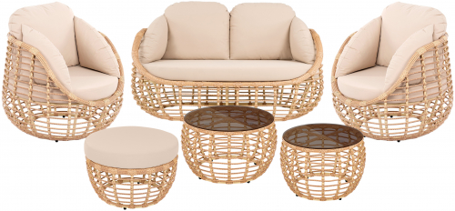 Каждый элемент объединён фирменным дизайном и высочайшим качеством материалов. Прочные алюминиевые каркасы, искусственный ротанг, устойчивый к выцветанию, и практичные ткани гарантируют долговечность и простой уход. Игра текстур - плотное плетение, прозрачное закалённое стекло и мягкие подушки - добавляет интерьеру глубины и тактильного комфорта. Этот комплексный набор - идеальное и готовое решение для создания респектабельной зоны отдыха на просторной террасе, у бассейна или в коммерческом лаунж-пространстве, где важна каждая деталь.