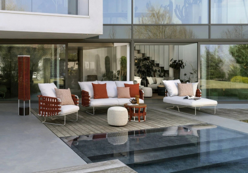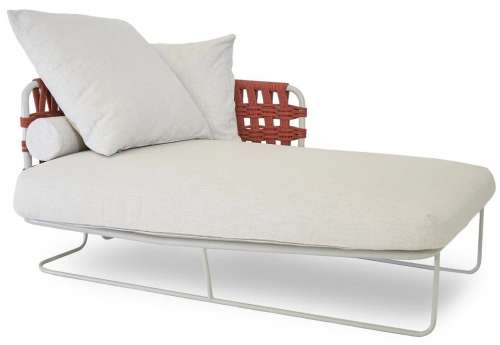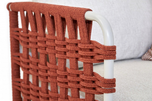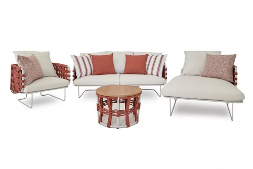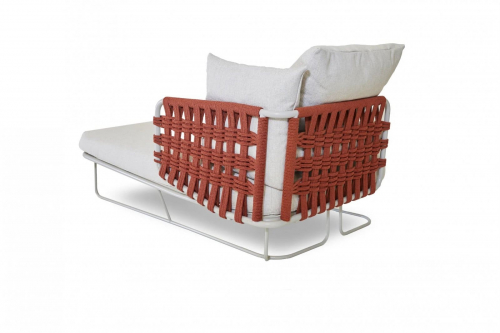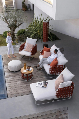 Коллекция Nido с ее насыщенными тонами встречает гостей беспрецедентной универсальностью: она идеально подходит как для светских мероприятий, так и для приватного отдыха. Баланс форм и объемов адаптируется ко всем различным пространствам, от домашних террас до элегантных и изысканных открытых площадок отелей и крупных заведений. Уникальная переплетающаяся веревочная система, являющаяся легким мотивом всей коллекции, обеспечивает крепкую плетеную спинку диванов и кресел. Мягкие подушки, чередующиеся однотонными цветами с геометрическими узорами, создают удобные поверхности для сидения. Металлические конструкции переплетаются с тканевыми веревками, создавая расслабляющее гнездышко на открытом воздухе. Изящный шезлонг Nido с извилистыми линиями, вдохновленными мягкими замысловатыми изгибами гнезда среди ветвей. Удобное место, откуда можно наслаждаться летним бризом. Шезлонг Nido с угловатой спинкой представляет собой сочетание теплых тонов и мягких линий. Металл в основании приподнимает конструкцию над землей, придавая ей необычную легкость.