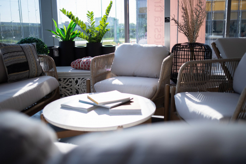 Крепкая алюминиевая рама оплетена синтетическим роупом. Обивка подушек выполнена из ткани олефин - прочного материала, устойчивого к воздействию грязи, влаги и УФ-лучей.