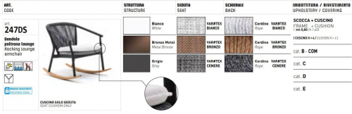 - Плетение на спинке выполнено из синтетического роупа VAR#ROPE. Плетение, разработанное и изготовленное компанией Varaschin Spa для своих наружных изделий, изготовлено из полиэстерового волокна, защищенного ПВХ-покрытием. Составленные таким образом различные нити скручены друг с другом и соединены вместе, образуя очень прочные и компактные канаты. Отличная устойчивость к плесени и ультрафиолетовым лучам.