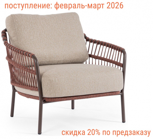 Лаунж кресло Talaia - это современный предмет мебели интересной формы и цвета, благодаря которому он оживит любое пространство, в котором находится. Кресло привлекает внимание и станет прекрасным дополнением гостиной зоны на открытом пространстве. Оно изготовлено из стали и имеет мягкие подушки на сиденье и спинке. Подлокотники и продуманная конструкция гарантируют комфорт во время использования. Плетеный корпус придает креслу удивительный характер. Ножки обеспечивают хорошую устойчивость.
