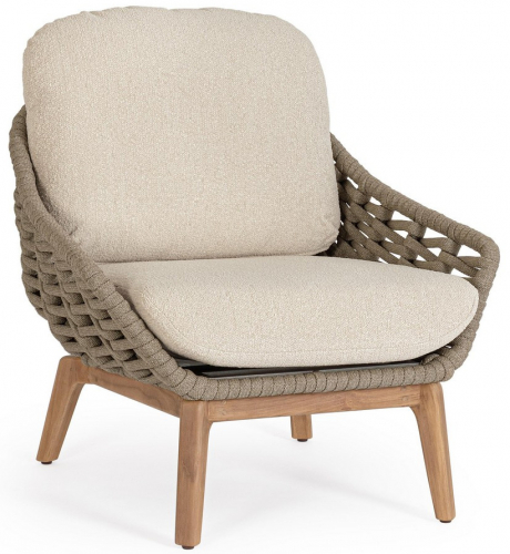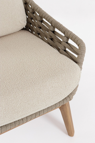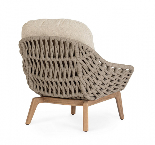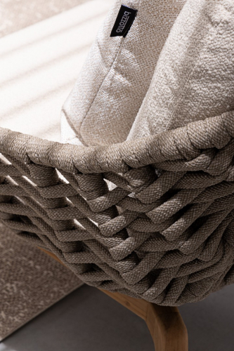Лаунж кресло Tamires - идеальное сочетание прочной конструкции, натуральных материалов и уникальной текстуры плетения, создающей ощущение роскоши и тепла в вашем пространстве. Ножки из тика придают креслу теплоту и естественную элегантность, гармонично сочетаясь с металлическим каркасом. Спинка и сиденье оформлены плетением из роупа, а мягкие подушки с эффектом букле беспечивают расслабленную и уютную посадку.