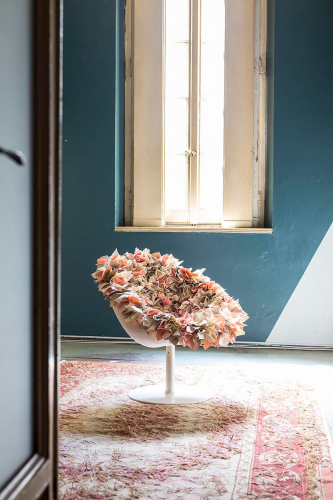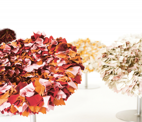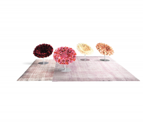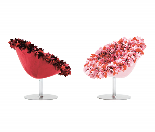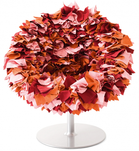 На тонкой хромированной металлической ножке расцветает букет лепестков, составленный из квадратов ткани, которые вручную сложены и сшиты один за другим умелыми руками с бесконечным терпением. Дань почти духовной красоте, заключающейся в простоте повторяемого жеста, открывающего грань между видением и реальным изображением. Слой лепестков оборачивает яйцевидный корпус, пока не будет покрыта вся поверхность. Аллегория снов, утонченная поэтическая трансформация, воспетая в объекте промышленного дизайна. Кресло Bouquet радует всех, кто в нем сидит, как букет цветов в подарок.