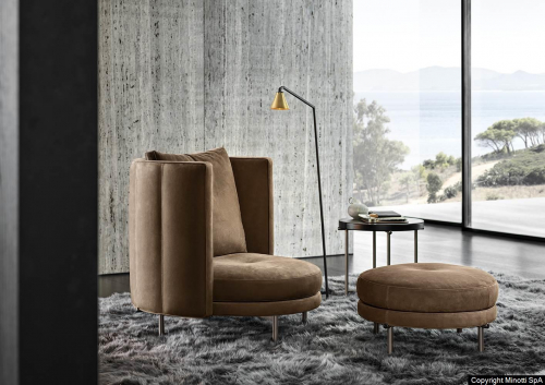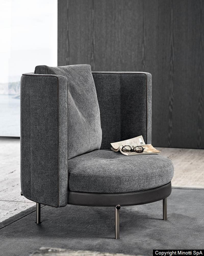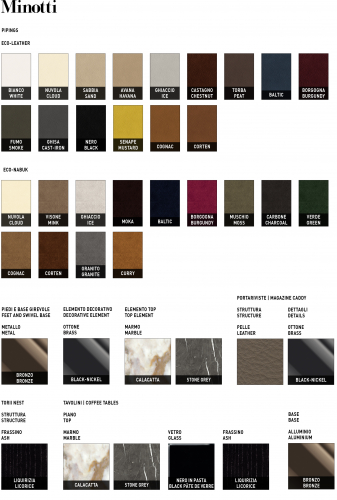 Тонкая спинка имеет вертикальную прострочку и окантовку, идущую по периметру амортизации, подчеркивая высокое качество ручной работы. Кант из эко-кожи и эко-нубука имеет слегка контрастирующий цвет, но того же оттенка, что и ткань в сочетании с текстильным покрытием, тогда как кожаные версии имеют тот же оттенок в сочетании с кожаной обивкой. Все элементы обивки системы можно индивидуализировать, выбрав покрытие: 100% ткань или кожа, или ткань с кожаной основой.