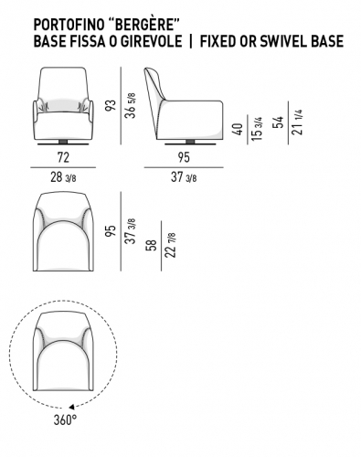 Кресло бержер Portofino имеет классический дизайн с современными нотками. Небольшие размеры и высокий комфорт для модели, которая доступна с фиксированным или поворотным основанием. Намеренно простой стиль подчеркивается портняжными деталями, такими как "конский шов", который может быть одного из следующих цветов: белый, черный, коричневый или песочный.