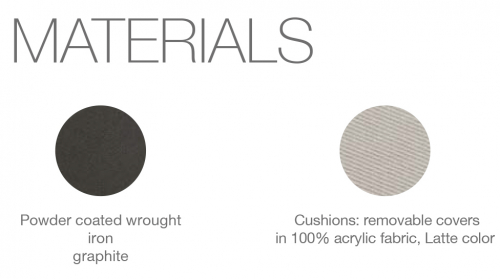 Съемные чехлы подушек выполнены из тканей Unopiu Color Collection, окрашенных с использованием новейших технологий производства, предназначенных для использования на открытом воздухе. Они долговечны, устойчивы к пятнам, плесени, дышат и особенно устойчивы к ультрафиолетовым лучам. Все они обладают такой же мягкостью на ощупь, как и натуральные волокна.