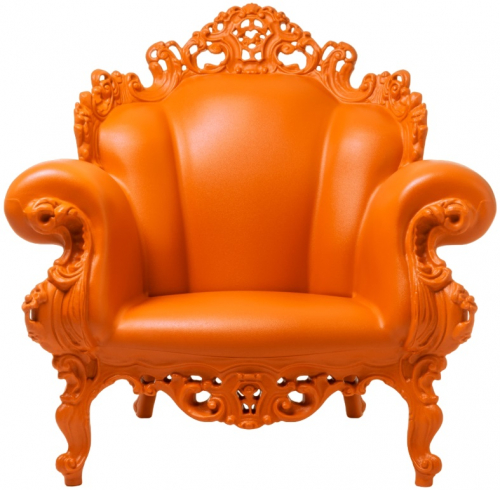 «Думаю, многие уже знают мое кресло Proust. Это романтическое кресло в стиле барокко, на котором вручную в технике пуантилизма нарисовано бесконечное количество разноцветных точек. Эти точки покрывают все кресло, как ткань, так и деревянные украшения. Это работа по перепроектированию. По сути, это сочетание псевдоантикварного кресла с деталью картины сада французского художника Синьяка. Начиная с 1978 года Proust выпускалось во многих вариантах, с использованием разных цветов, материалов и размеров, и даже было сделано из керамики и бронзы. Оно путешествовало по всему миру и было размещено во многих музеях.