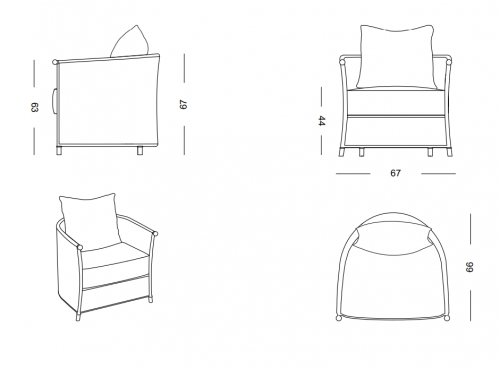 Чехлы подушек выполнены из уличных тканей - дышащих, водоотталкивающих, устойчивых к плесени, они не обесцвечиваются и устойчивы к УФ-лучам. Кроме того, их можно стирать в стиральной машине при 30 °C, и они просты в уходе. Чехлы подушек могут быть выполнены из тканей категорий C, D, E, F, G, S, а также из собственной ткани клиента. Посмотреть палитру материалов Samuele Mazza.