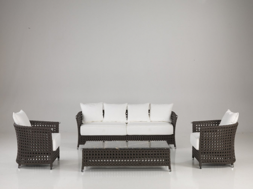 Корпус мебели реализуют из крашеного алюминия, покрытого плетением из специального синтетического волокна того же цвета.