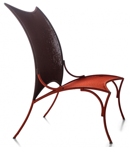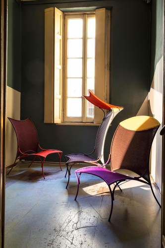 Коллекция Arco создана с использованием плетеных нитей, которые обычно используются для рыболовных сетей, все рисунки разные и оригинальные, как и их названия. Сотканные вручную, они человечны в своих несовершенствах и недостатках. Модель имеет окрашенную стальную конструкцию и цветные нити из полиэтилена, сплетенные вручную.