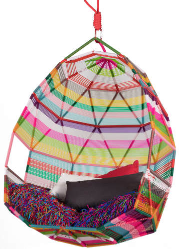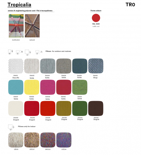 Трубчатый стальной каркас Tropicalia становится отправной точкой, которую дизайнер использует для творческого преобразования. Каркас замаскирован обмоткой полимерных шнуров, которая похожа на карандашные линии, создавая графическую и структурную поверхность, одновременно являющуюся частью ее конструкции и своеобразной индивидуальностью: игривую при использовании двух или трех цветов, изысканную в одном цвете.