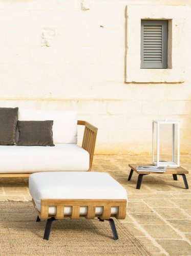В модульной коллекции Welcome тиковые планки были изогнуты паром с использованием старинной техники ручной работы. Все подушки из коллекции Welcome доступны в более чем 30 различных цветах, что позволяет создать персональную атмосферу на открытом пространстве.