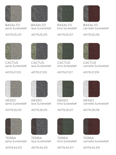 Возможные цвета подушки из ткани Sunbrella: жемчужный (perla), лава (lava), тимьян (timo), корица (cannella),