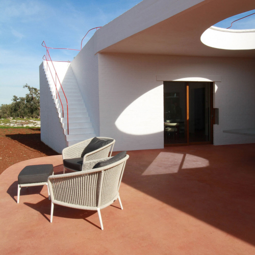 Knot - это коллекция для обеденной и гостиной зоны, которая отличается красивыми плетеными элементами ручной работы, поддерживаемыми легкой алюминиевой рамой. Используя технику макраме модифицированного рифового узла, этот ансамбль необычного дизайна настолько же прочен, насколько и превосходен.