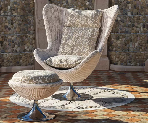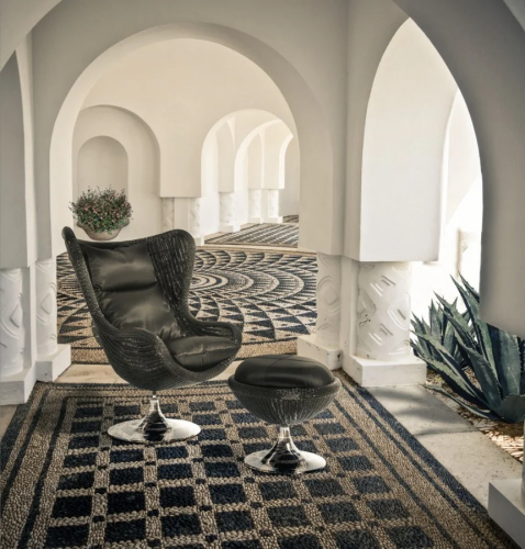 Коллекция Aldebaran отдает дань уважения знаменитому креслу и пуфу, которые уже более полувека считаются легендой международного дизайна. Она была переосмыслена дизайнером DFN с немного большими размерами и выполнена из плотного плетения, что создает компактную и непрерывную поверхность, очень приятную на ощупь. Сиденье пуфа представляет собой мягкую подушку. Основание хромированное и имеет конусообразную форму. Это уникальный предмет коллекции, в которую также входят также кресло и низкий столик. Aldebaran - это удобный пуф, отличающийся всеобъемлющим дизайном, который предлагает пользователям комфорт и уединение.
