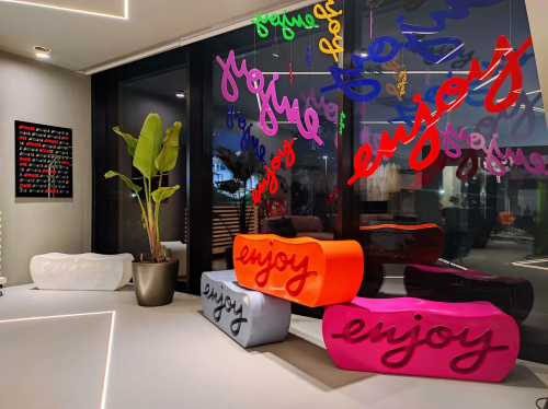 Извилистая, эргономичная и симметричная, функциональная скульптура, символ счастья: Enjoy - это скамья, разработанная Адрианой Ломанн и Джо Колонна Романо, задуманная и изготовленная с двумя сиденьями, потому что радость должна быть общей! Скамейка Enjoy универсальна, готова воплотить свое стремление к радости жизни как в помещении, так и на открытом воздухе.