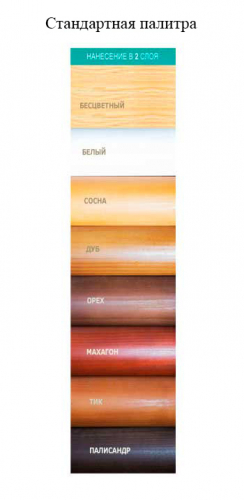 Стандартная палитра древесины представлена на фото, эти цвета доступны для заказа при изготовлении изделий до 50 ед. Она включает в себя следующие цвета: бесцветный, белый, сосна, дуб, орех, махагон, тик, палисандр.