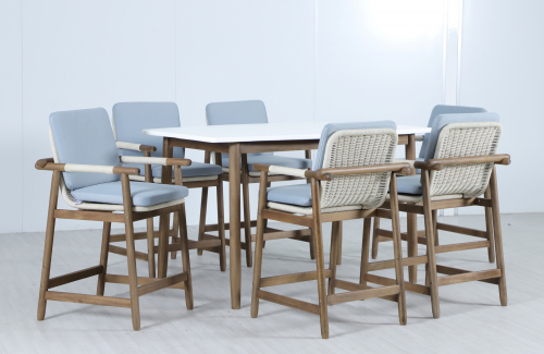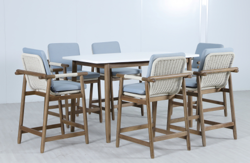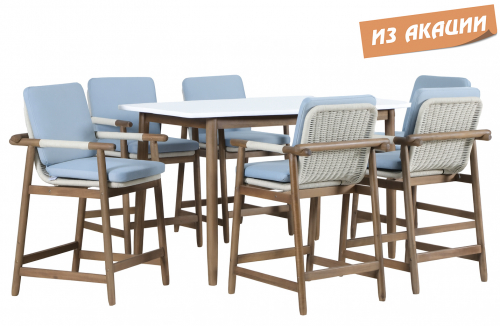 Барная группа Apoyo на 6 персон - это стильная коллекция уличной мебели из массива АКАЦИИ, в которой сочетаются натуральное верёвочное (роуп) плетение, тёплая текстура дерева и комфортные подушки. Комплект барной мебели состоит из шести полубарных комфортных кресел и барного стола. Превосходное решение для террасы или веранды, подходящее для тех, кто ценит долговечность и эстетический вид уличной мебели.