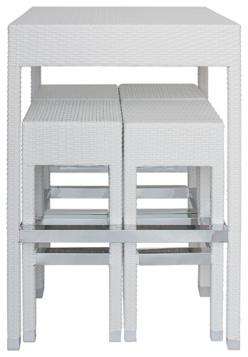Комплект плетеной барной мебели выполнен из алюминия, оплетенного искусственным ротангом (полиэтиленовая нить). Столешница стола выполнена из закаленного стекла. Комплект прекрасно подойдет для открытой площадки возле бассейна, барной зоны в саду или на террасе. При необходимости все 4 табурета задвигаются под стол, что значительно экономит место.