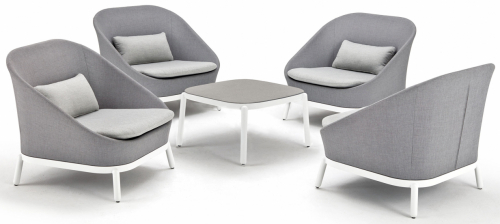 Комплект Bayside, состоящий из четырех кресел и журнального стола, имеет крепкий стальной каркас. В креслах его дополняет мягкая текстиленовая обивка и удобная акриловая подушка, в журнальном столике каркас сочетается со столешницей из каменного стекла. Такие сочетания делают комплект невероятно комфортным, функциональным и стильным, подходящим для домашних и коммерческих интерьеров и открытых пространств.