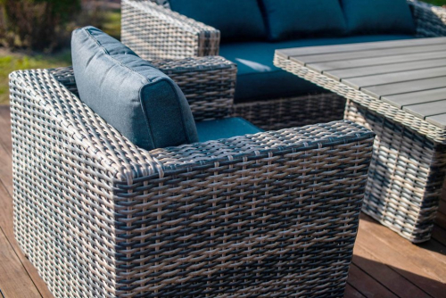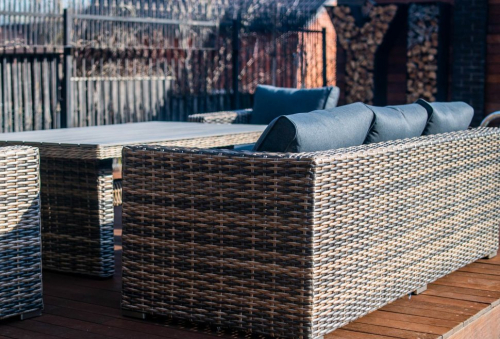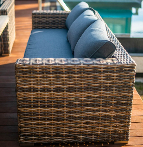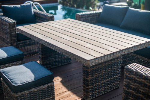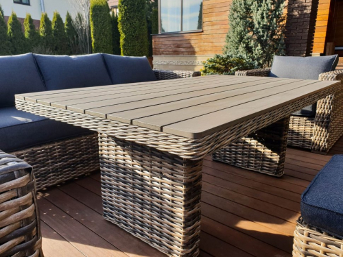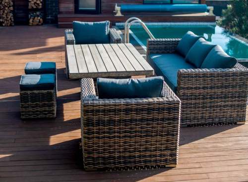 Материал: поливуд (искусственное дерево), искусственный ротанг, алюминиевый каркас, подушки olefine серого цвета.