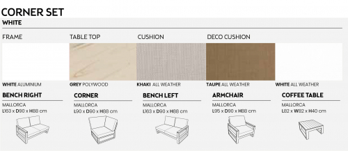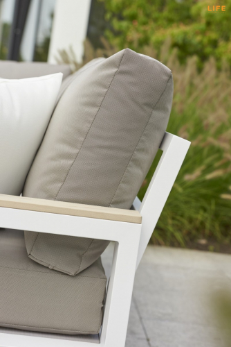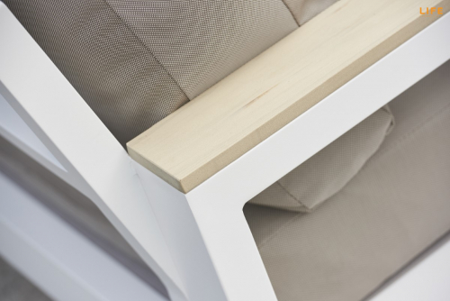 С лаунж комплектом Mallorca вы можете насладиться современным дизайном и теплой комбинацией алюминиевого каркаса с подлокотниками из ДПК POLYWOOD. Мягкие подушки на спинке и сиденьи модулей и кресла могут использоваться на улице круглый год, что обеспечивает максимальное удобство использования мебели Life Outdoor Living.