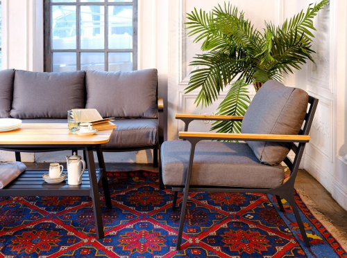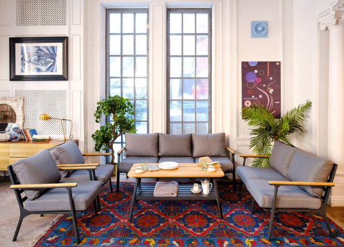 Concorde ХL - это современная коллекция садовой мебели из алюминия. Комбинация каркаса темного цвета с подлокотниками из натурального тика и спокойного тона глубоких и удобных подушек дает запоминающийся комплект садовой мебели, который займет достойное место на любой веранде.
