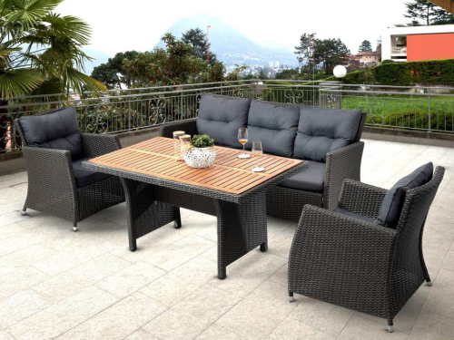 Обеденный комплект AFM-308G состоит из прямоугольного стола, дивана и двух кресел с серыми подушками, что обеспечивает комфортное расположение 4-5 человек. Благодаря дивану, этот комплект можно использовать во время обеда и отдыха после принятия пищи. Максимально функциональный и очень удобный плетеный комплект можно расположить на терассе, в саду или на любом другом открытом пространстве. Стальной каркас и плетение из искусственного ротанга коричневого цвета обеспечивают устойчивость и долгий срок службы.