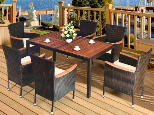 Разборный комплект плетеной мебели AFM-460B Brown от бренда Afina. В составе комплекта: стол и 6 кресел. Первоклассная лоза из синтетического ротанга коричневого цвета стойкая к любым погодным проявлениям. Крепкий каркас из стали с полимерным антивандальным покрытием и отличным качеством сварки. Изделие сплетено вручную нашими мастерами под жестким контролем качества на каждом этапе производства. Лоза максимально приближена по рельефу и текстуре к естественному материалу. Столешница выполнена из акации, белые подушки в комплекте с креслами. Комплект подходит для использования на улице и внутри помещения в любую погоду. Не боится влаги, прямых солнечных лучей и холода.