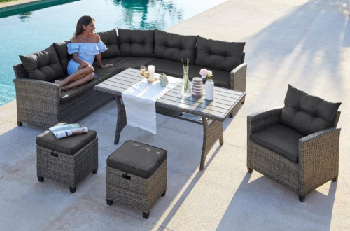 Комплект мебели AFM-373G из искусственного ротанга покорит Вас привлекательным видом и удобством. В составе комплекта: 2 дивана, угловой элемент, стол, одно кресло и 2 пуфа. Высококачественная лоза из полиротанга серого цвета стойкая к любым атмосферным явлениям. Крепкий стальной каркас с полимерным антивандальным покрытием и отличным качеством сварки. Изделие сплетено вручную мастерами под жестким контролем качества на каждом этапе производства. Лоза максимально приближена по рельефу и текстуре к естественному материалу. Идеально подходит для использования на улице и внутри помещения в любую погоду. Не боится воды, солнца и минусовой температуры. Диваны можно скрепить между собой скобами или раздвинуть друг от друга.